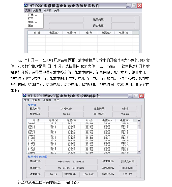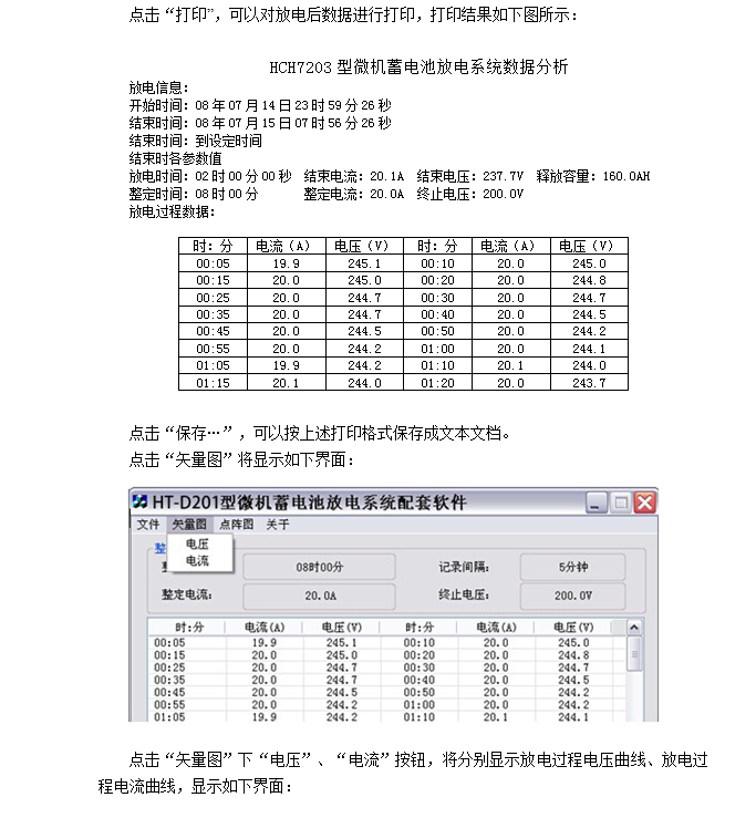5.5 記錄放電過程的電流電壓值(每5分鐘一筆),供事后分析查閱。放電數(shù)據(jù)可通過U盤上傳至電腦,使用配套軟件對其進(jìn)行全面分析,數(shù)據(jù)可以以報表、圖形等形式顯示,并可通過打印機(jī)打印數(shù)據(jù)及圖形,方便用戶查閱和整理。